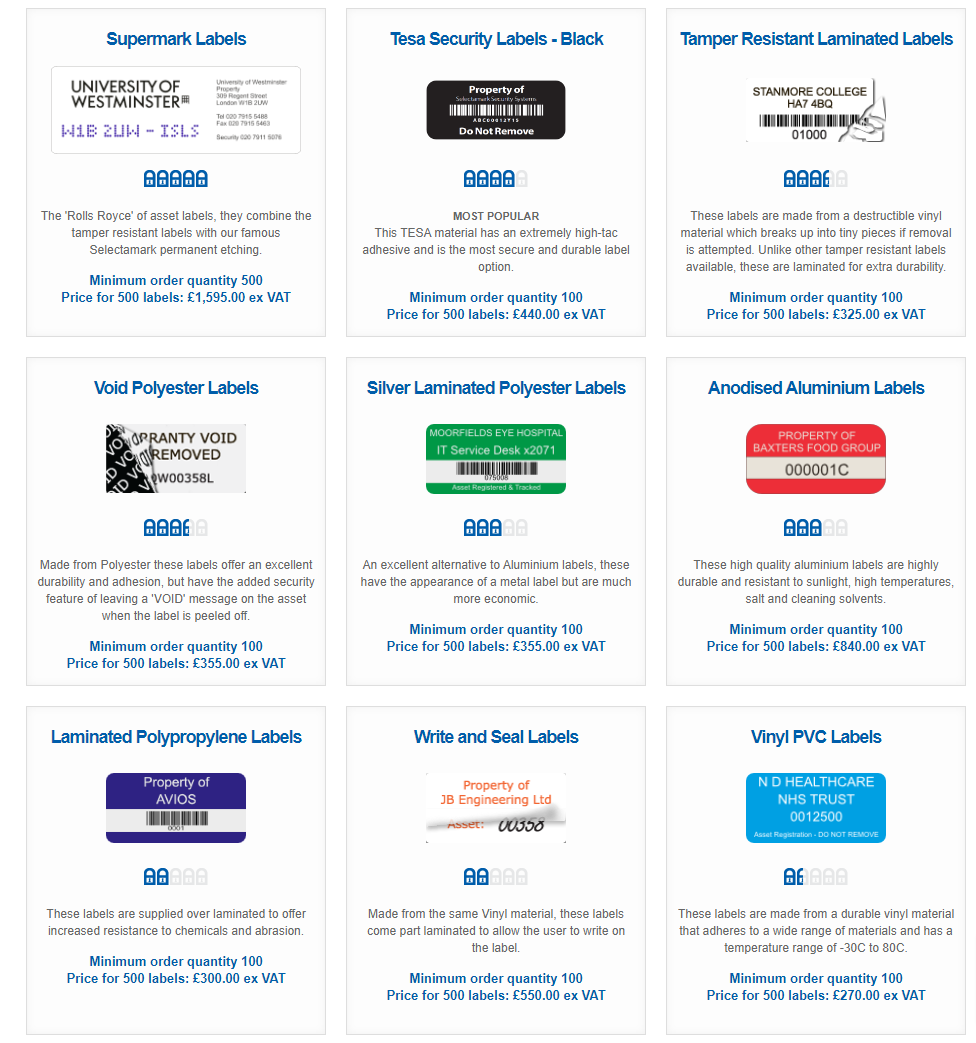 A selecta cégnek van egy külön oldala, ahol a közszférának kínál jelölő címkéket. Egy címke esetében van maratás, akár UV maratás is, a többi csak különlegessen erős ragsztó.