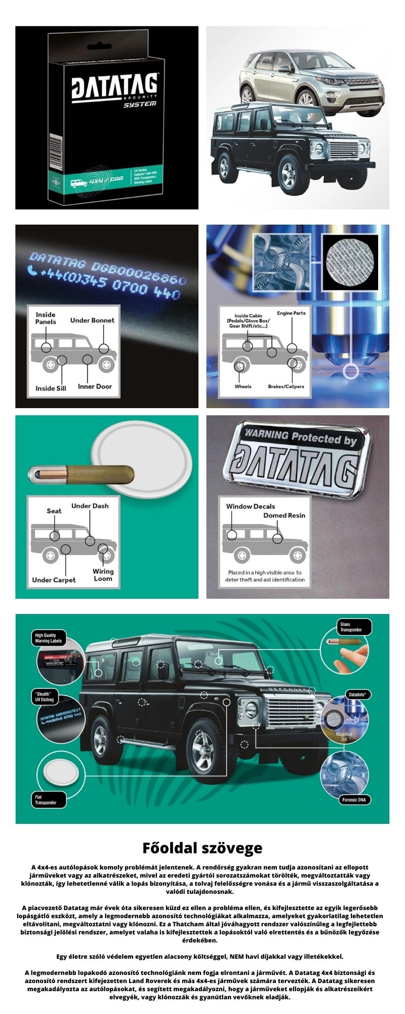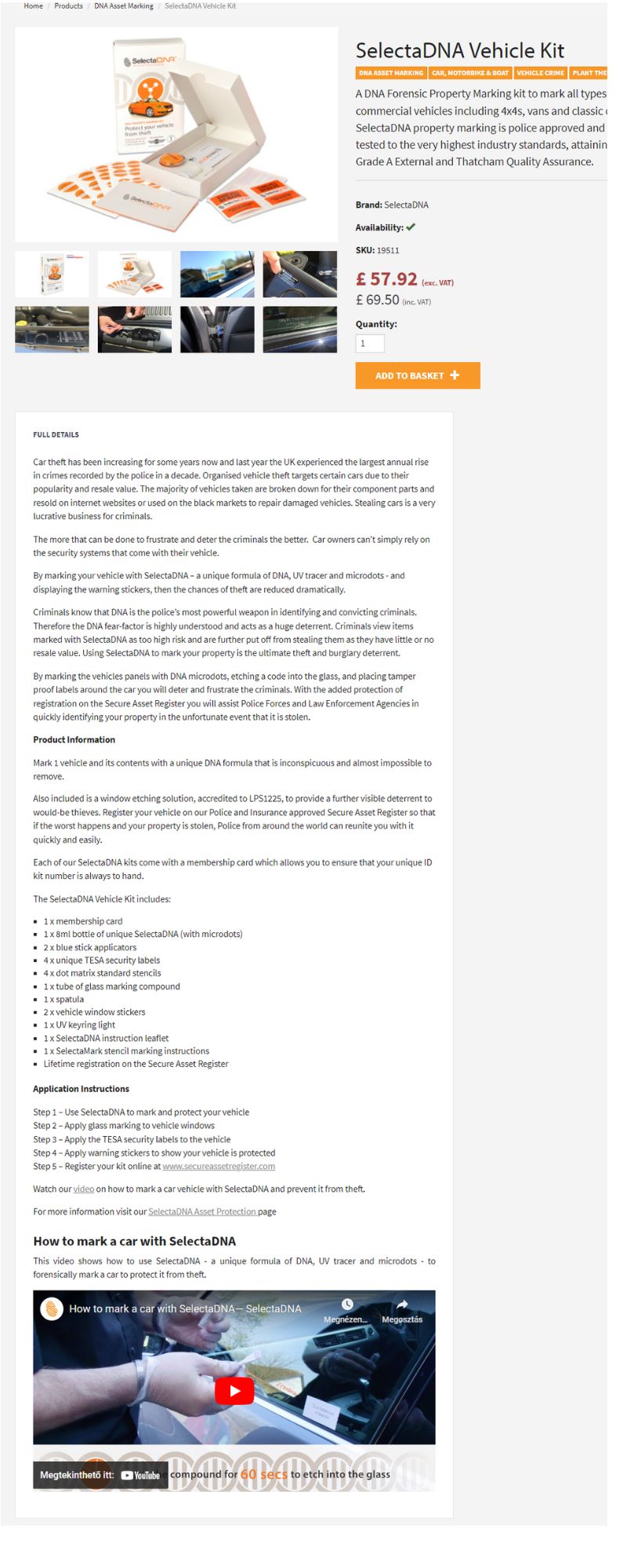 DNS-védelem: Minden SelectaDNA-készlet egyedi DNS-kódot tartalmaz. Ez a kód lehetővé teszi a rendőrség számára, hogy azonosítsa és visszaszolgáltassa az Ön tulajdonát, és összekapcsolja a bűnözőket az általuk elkövetett bűncselekményekkel. A DNS emellett hatalmas lopástól való elrettentő hatással is bír.