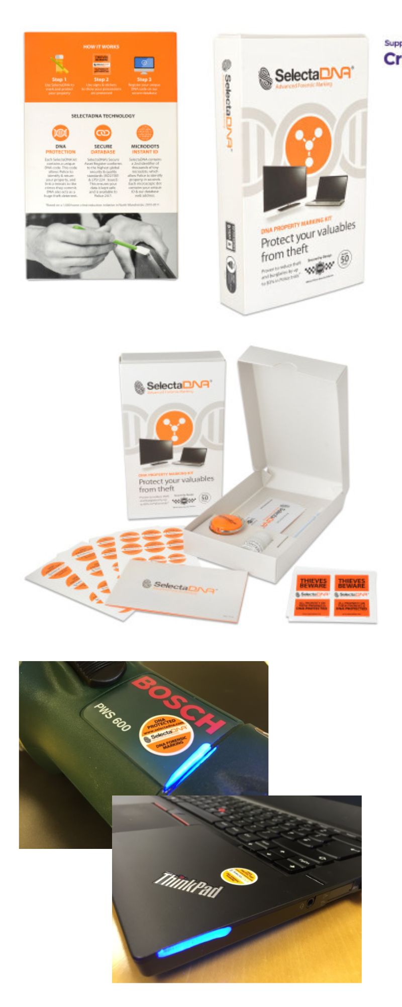 DNA protection: Each SelectaDNA kit contains a unique DNA code. This code allows Police to identify and return your property, and link criminals to the crimes they commit. DNA also acts as a huge theft deterrent.